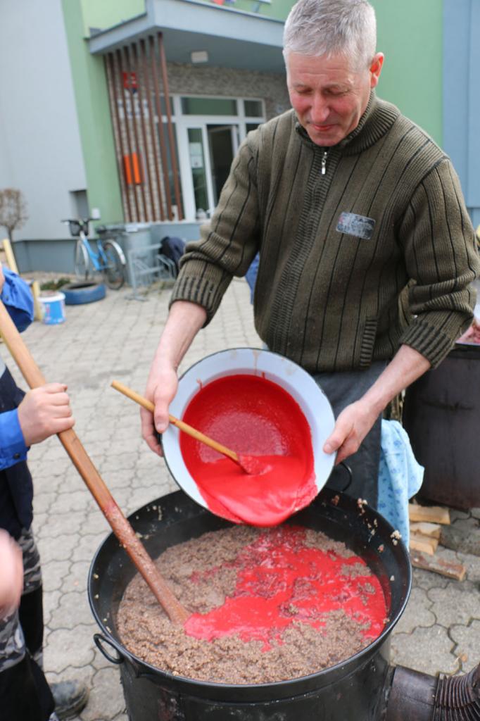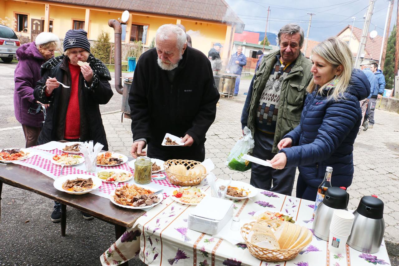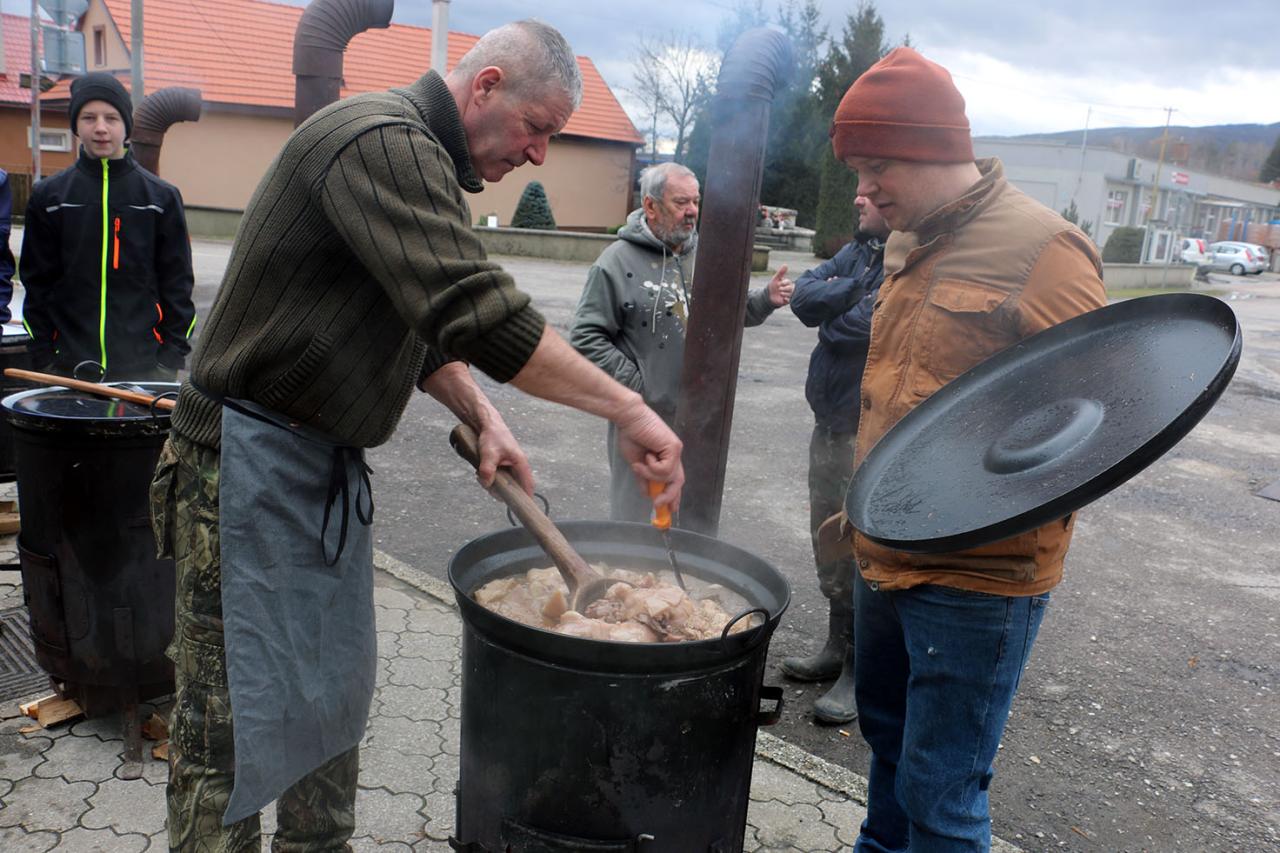 Takže keď sa ráno o siedmej pred obecným úradom zišla asi dvadsiatka ochotných ľudí, mohli sa všetci hneď pustiť do práce. Ženy v kuchyni, chlapi pri kotloch a rozrábke mäsa. Robota šla všetkým od ruky. Čochvíľa sa už dymilo z kotlov. Aj z kuchyne nás omámila vôňa raňajok, mozočky na cibuli s vajíčkami chutili. Spracovali sme štyri bravčové polovičky, z ktorých sme uvarili tri kotly kaše, 80 l kapustnice a urobili 90 kg klobás. Na ochutnávku zabíjačkových špecialít sme mali restovanú pečienku, pečené mäso, podhrdlinu na kyslo s cesnakom, ako prílohu chlieb, kyslé a kvasené uhorky, feferónky, čalamádu a horúci čaj aj s rumom. Sme radi, že ochutnávka sa nám opäť vydarila a naplnila chuťové poháriky všetkým „koštovačom“.