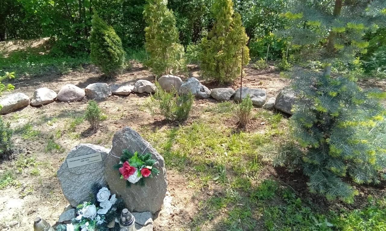 Pamätník sa nachádza na konci cintorínskeho chodníka. V minulosti tam bola zanedbaná časť nášho cintorína, ktorú sme skulturnili a vyložili kameňmi.V pozadí parčíka som vysadila mladé smriečky, donesené z hory, časom vyrastú a budú peknou kulisou. Aby mohli rásť a nezadusila ich burina, musíme sa o ne starať počas sezóny a v čase sucha aj zalievať. Pravidelne aj s Petrom Benkom kosíme trávnik, v ktorom má prevahu burina ktorej sa stále darí, trávnik ale trpí nedostatkom slnka, pretože ho tieni lipa.