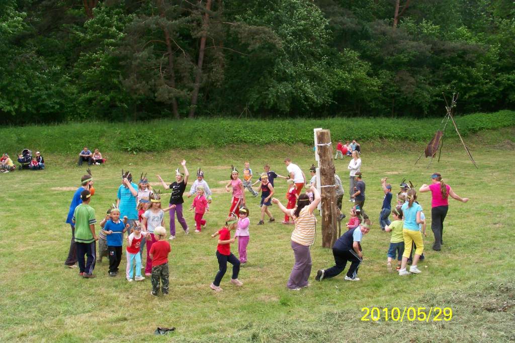 Zúčastnilo sa asi 40 detí a rodičia, deti dostali farebné čelenky. Na začiatku s náčelníkom Apačov "vyfajčili fajku mieru" a potom plnili bojové úlohy:- stopovali bledú tvár, lovili tomahavkom bizóny, strieľali lukom a šípom do lietajúceho sokola, potom kopijami lovili ryba v jazierku, zajzdili si na indiánskych mustangoch. Nakoniec pri indiánskom toteme museli obstáť v skúške najťažšej - ani sa nepohnúť, ani brvou nemrknúť, keď okolo nich lietali ostré šípy, tomahawky a kopije. Obstáli všetci - nakoniec im čelenky zdobili perá sokola. Každému podľa toho, aký bol zdatný a čestný v boji náčelník prijal do radov bojovníkom kmeňa Apačov.